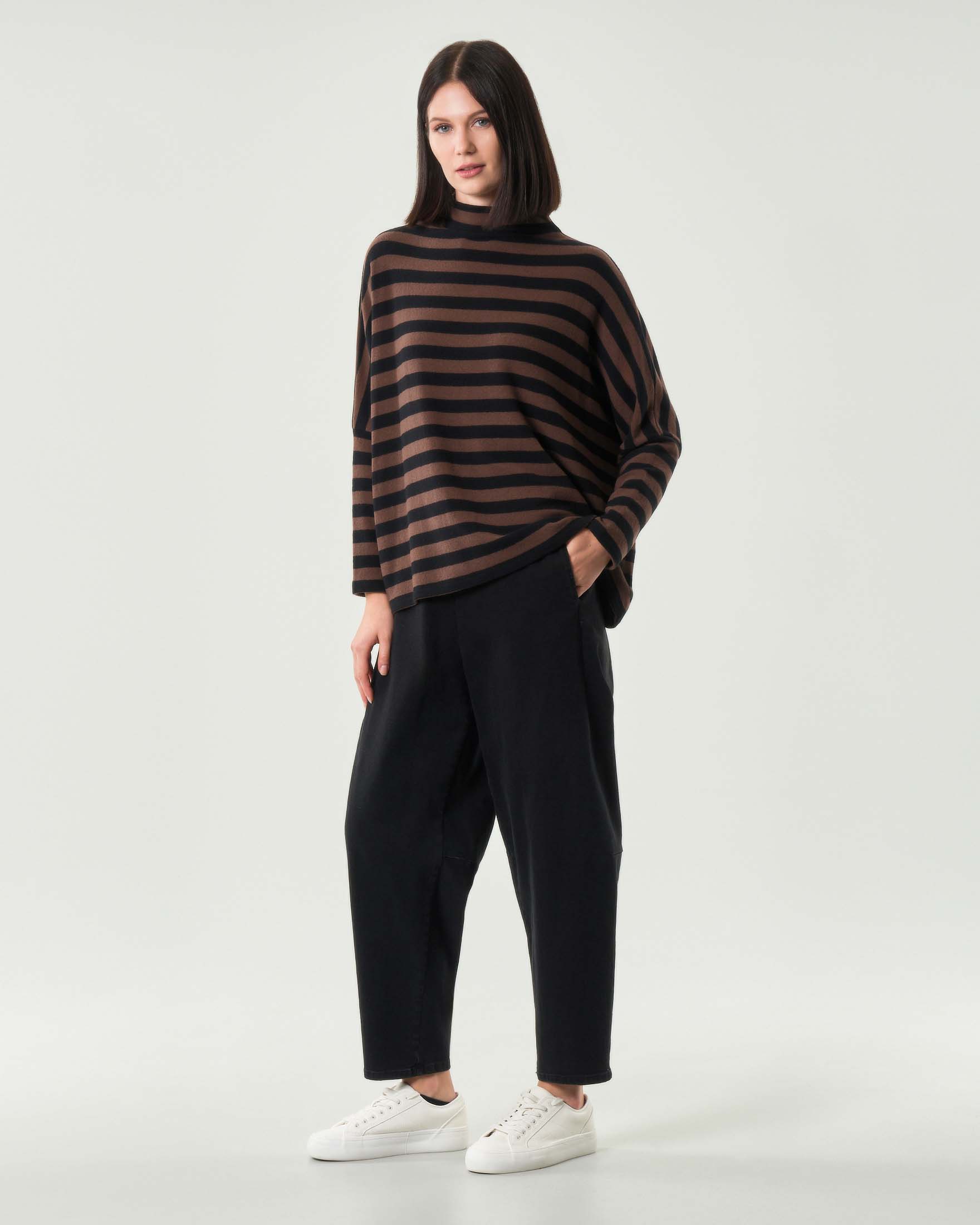 Maglia marrone a righe nere Jurerê in misto cotone dalla linea boxy con colletto in piedi