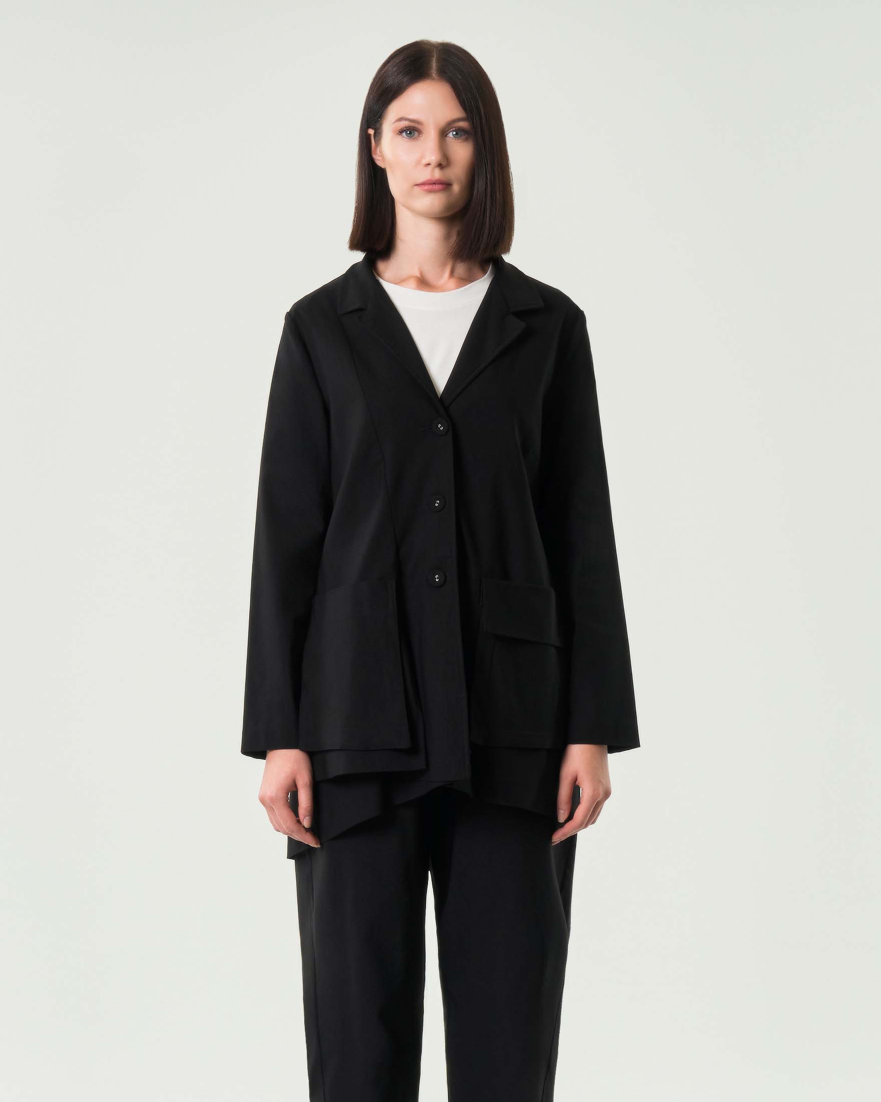 Giacca nera Jurerê in bengalina di viscosa con scollo a rever e motivo a pannelli sul fondo
