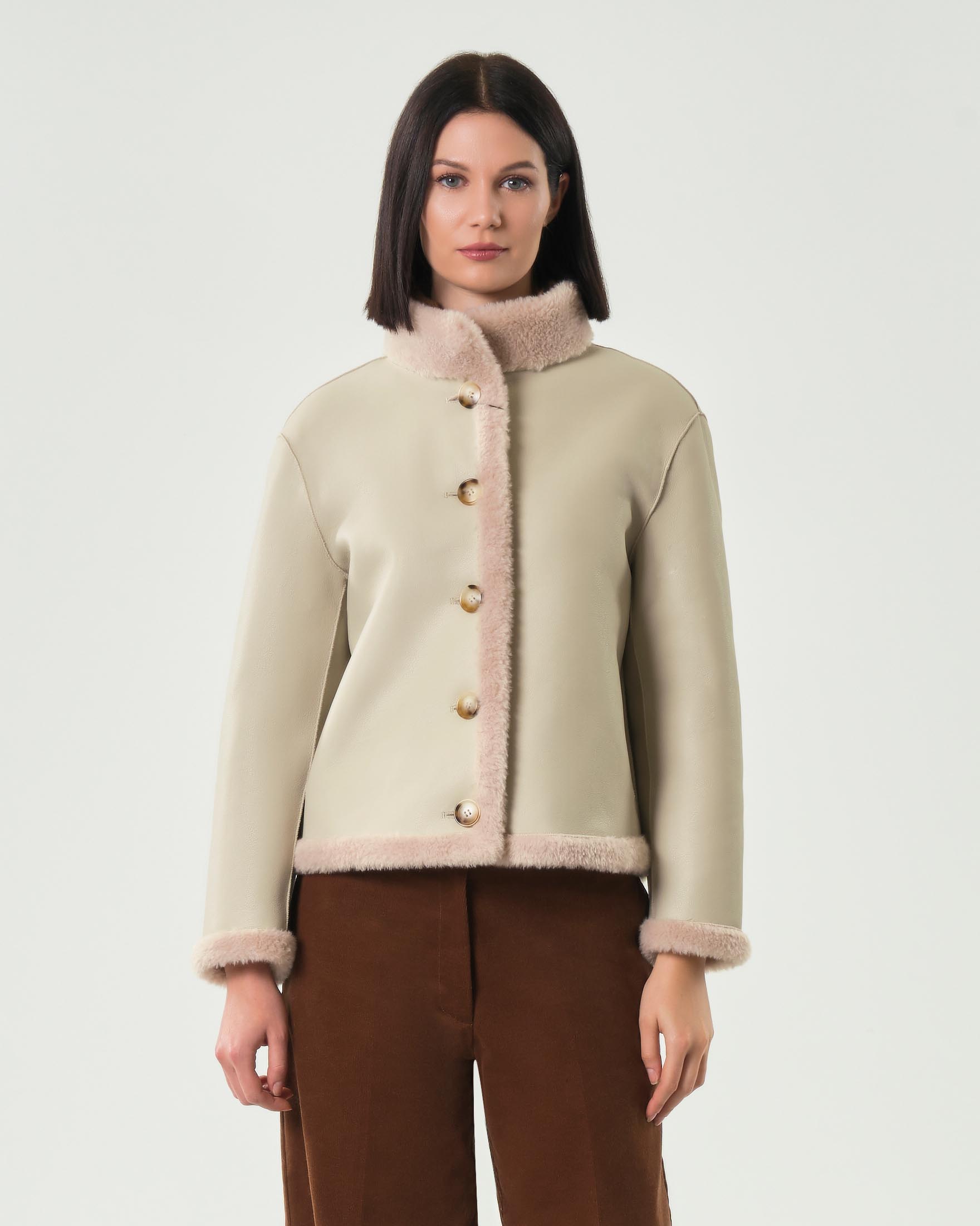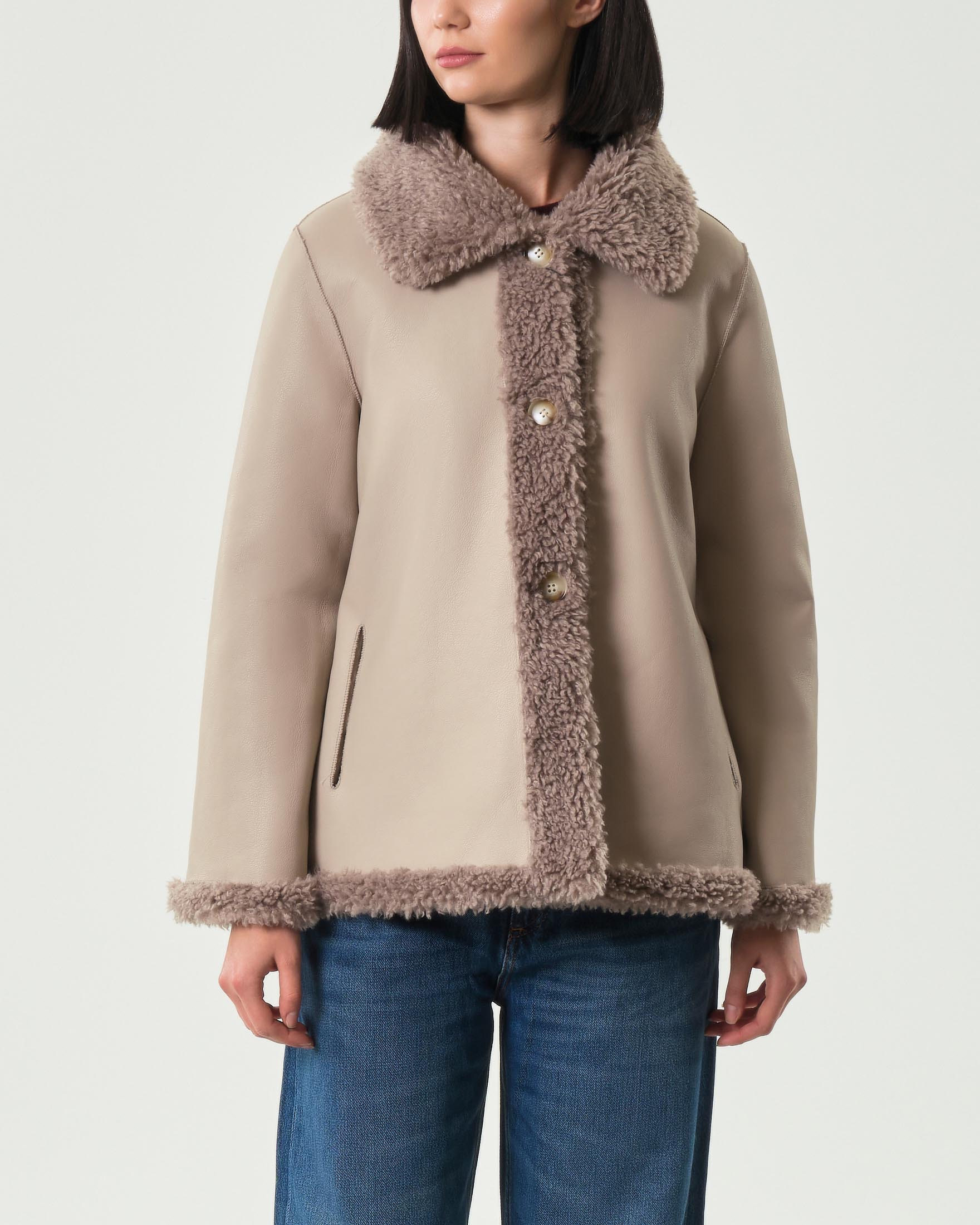 Ecopelliccia color taupe Hlo! effetto shearling reversibile con colletto a camicia