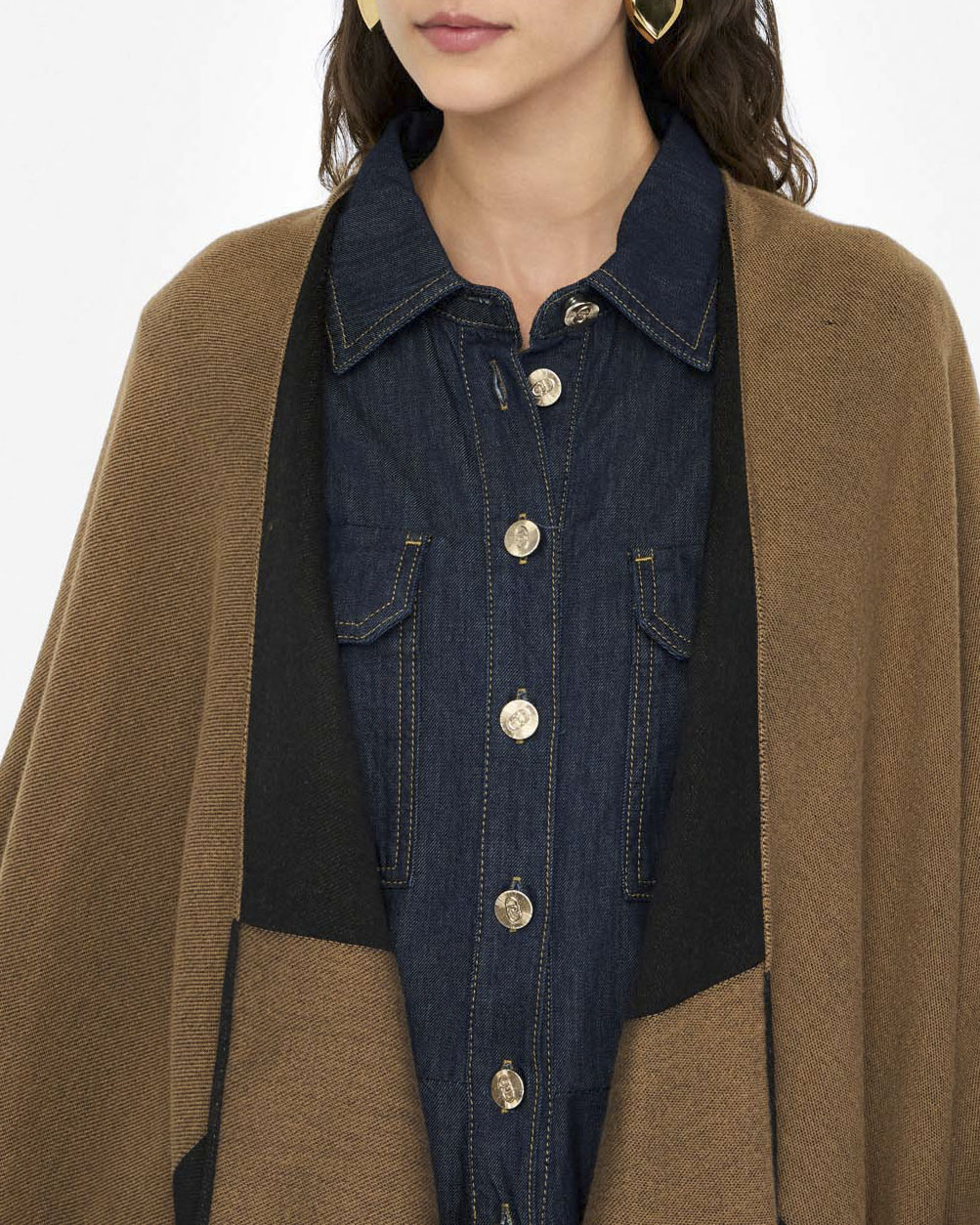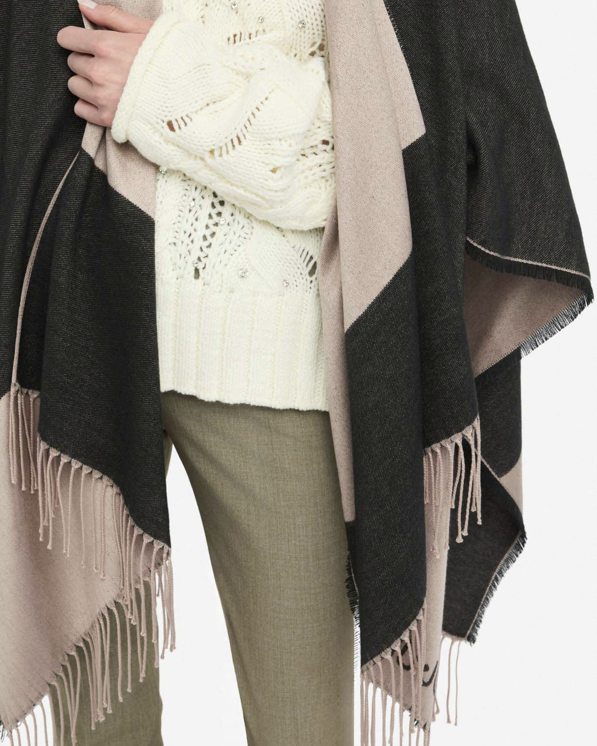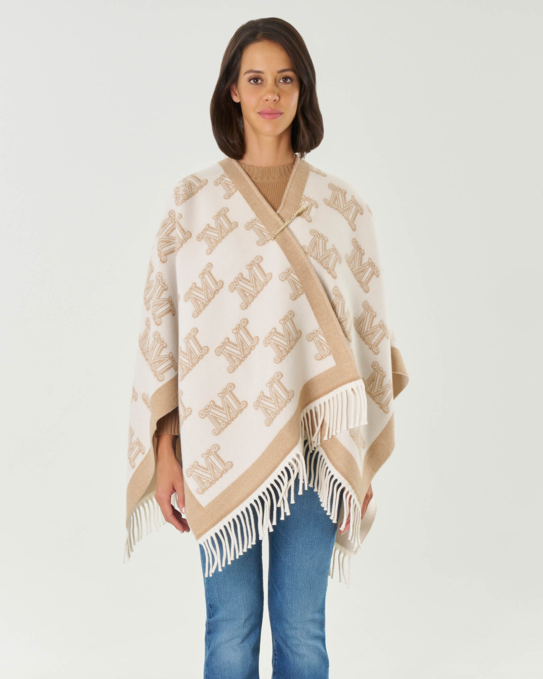 Mantella in doppio tessuto di pura lana a motivo monogramm sabbia e beige con spilla da balia in str...