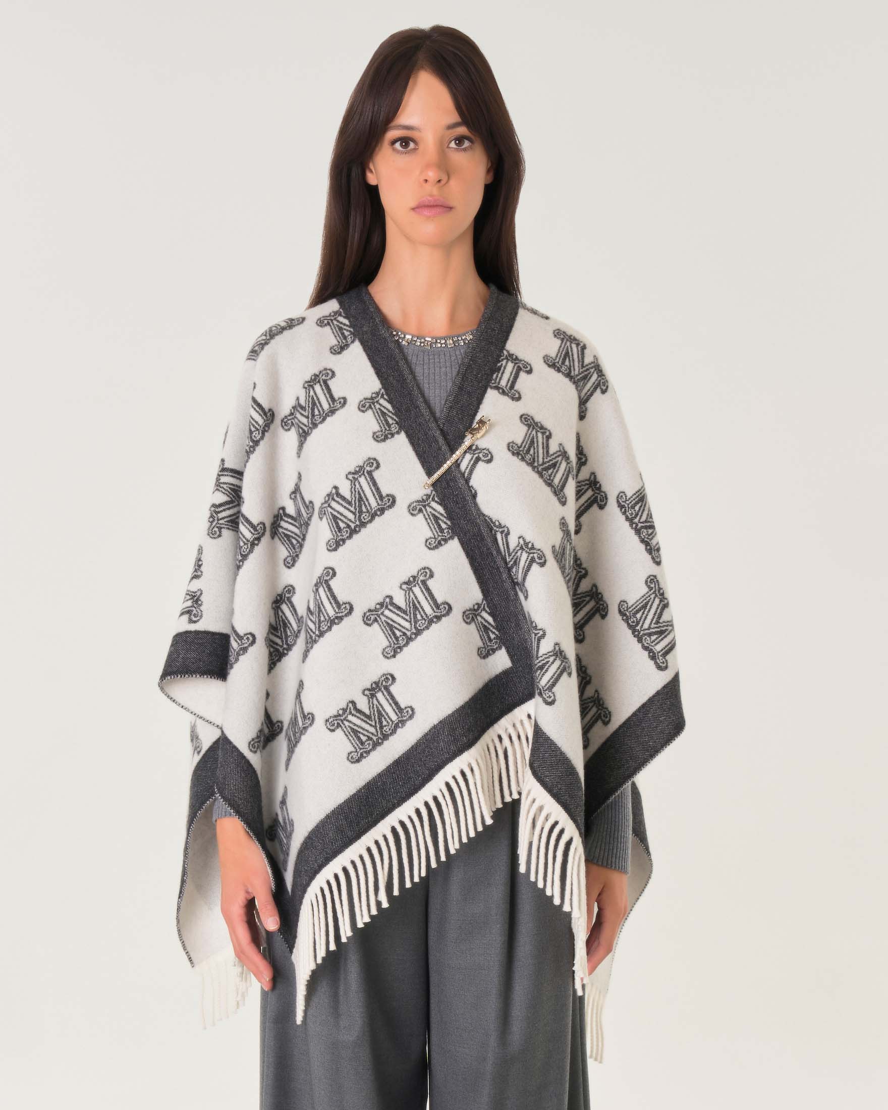 Mantella in doppio tessuto di pura lana a motivo monogramm color bianca e nera con spilla da balia i...