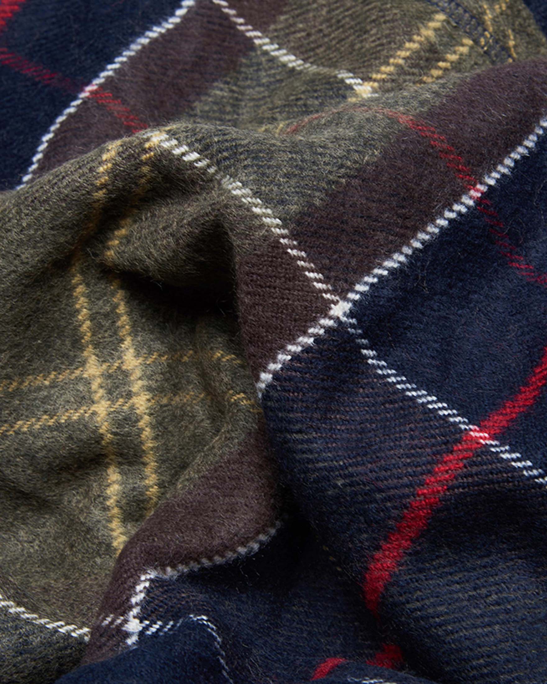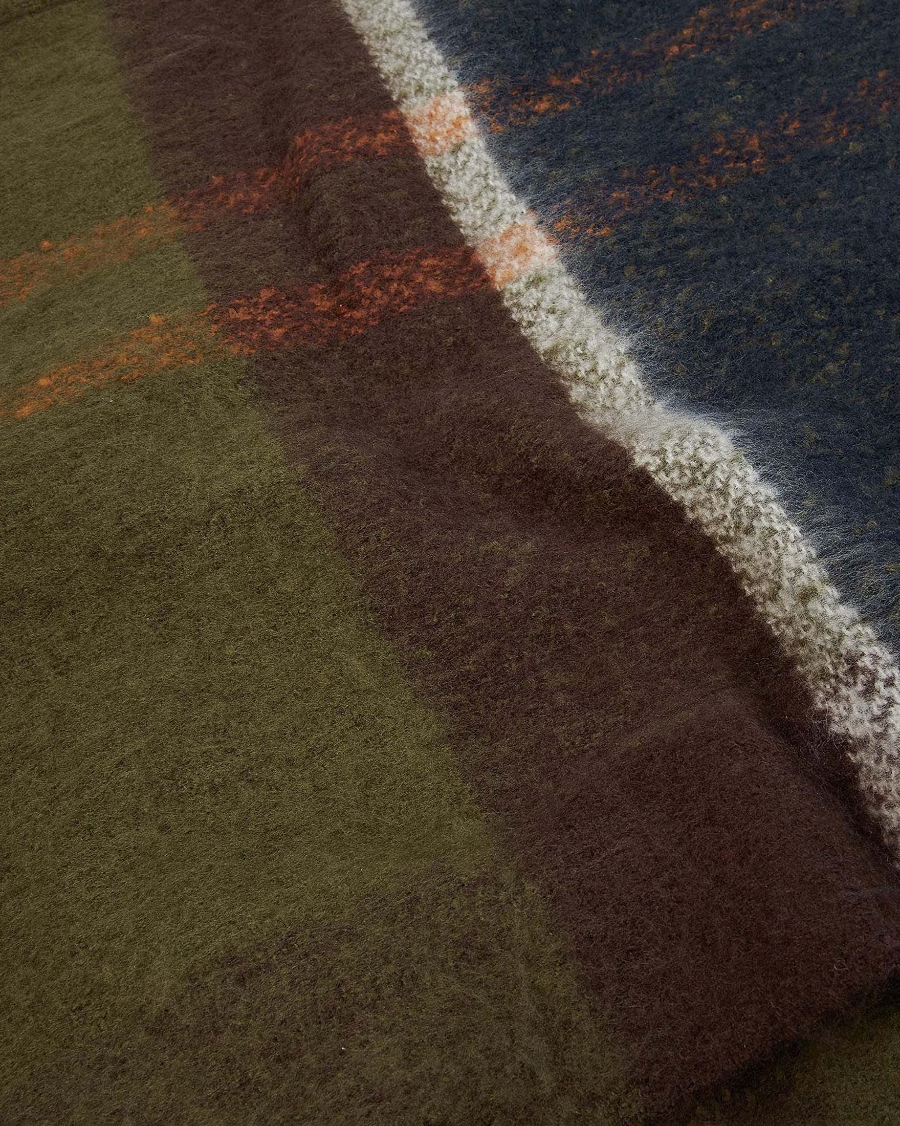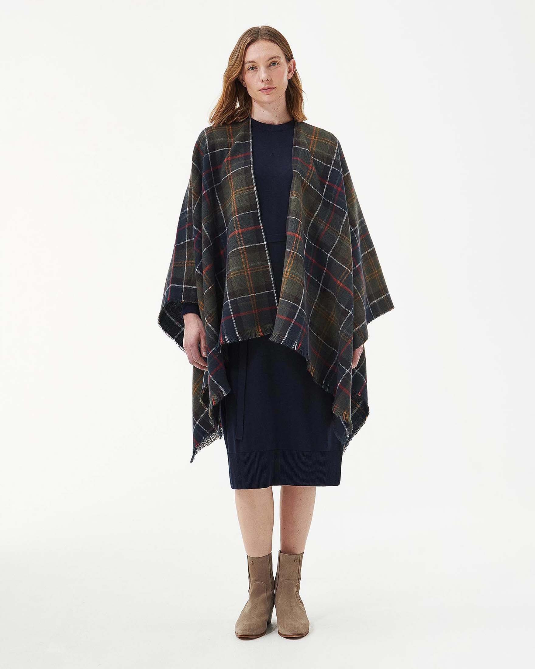 Mantella Barbour in tessuto effetto mohair a fantasia tartan verde e blu con frange al fondo