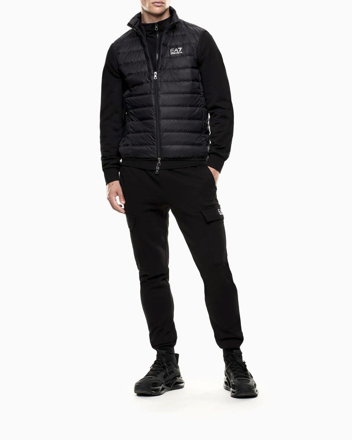 Piumino EA7 nero in tessuto stretch con cappuccio e patch logo applicata