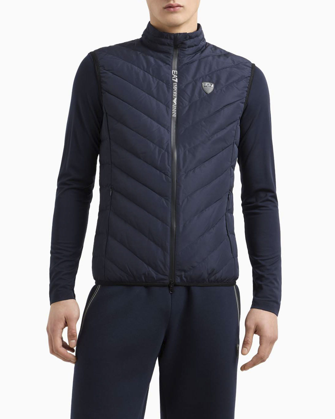 Gilet EA7 blu in piuma con logo stampato sul petto