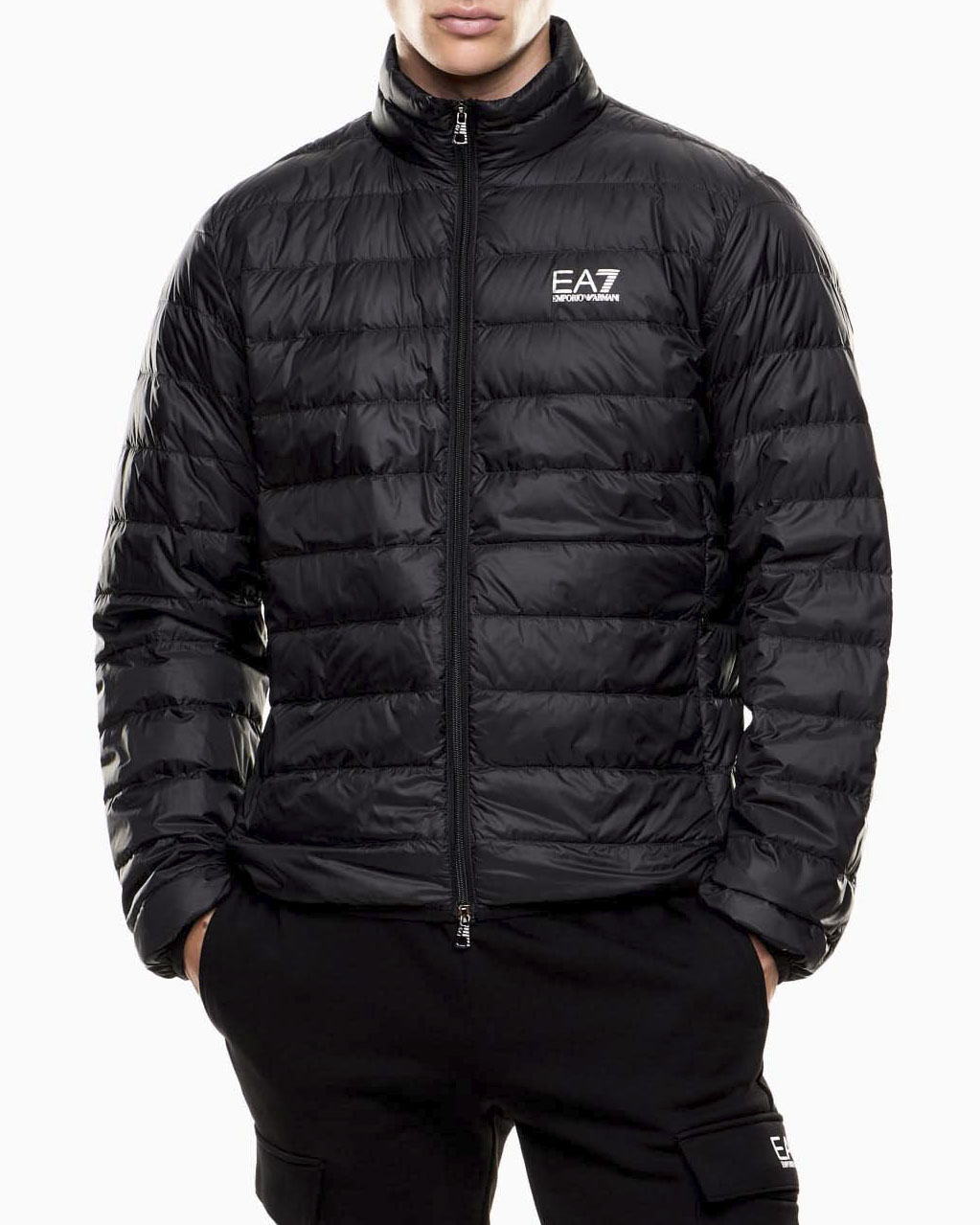 Piumino senza cappuccio EA7 nero in piuma con logo stampato