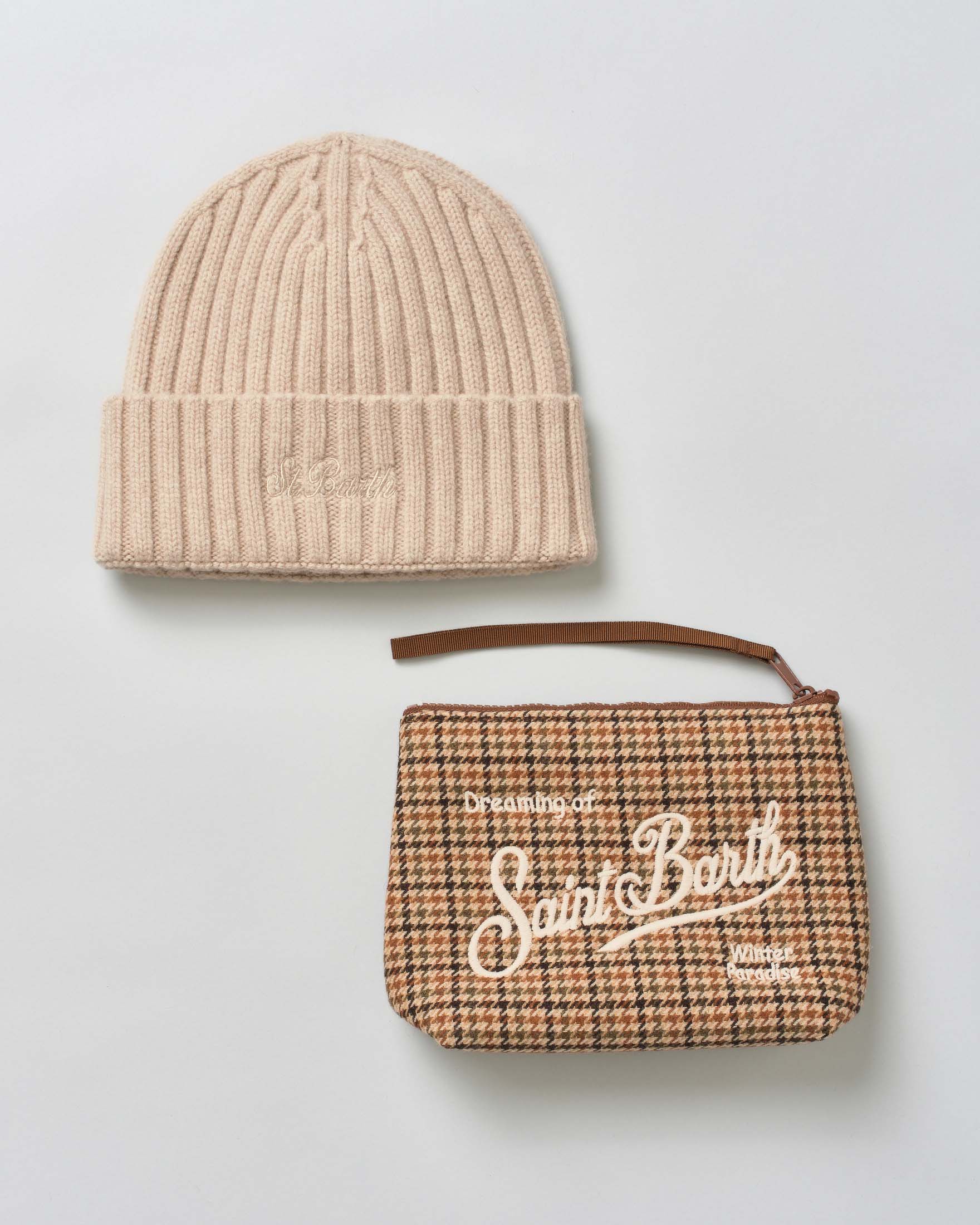 Set idea regalo MC2 Saint Barth beige composto da pochette pied de poule e berretto