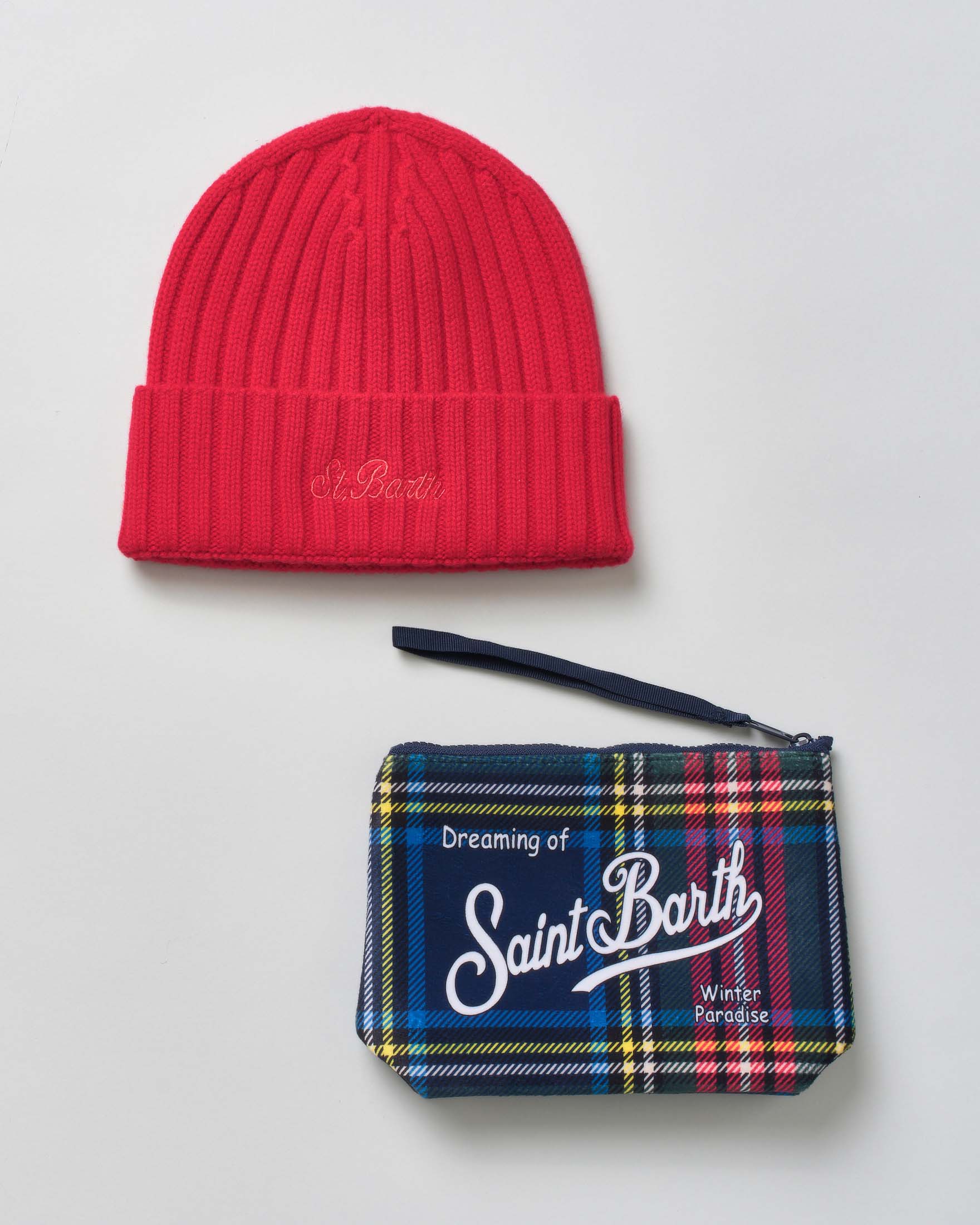 Set idea regalo MC2 Saint Barth composto da pochette tartan check e berretto rosso