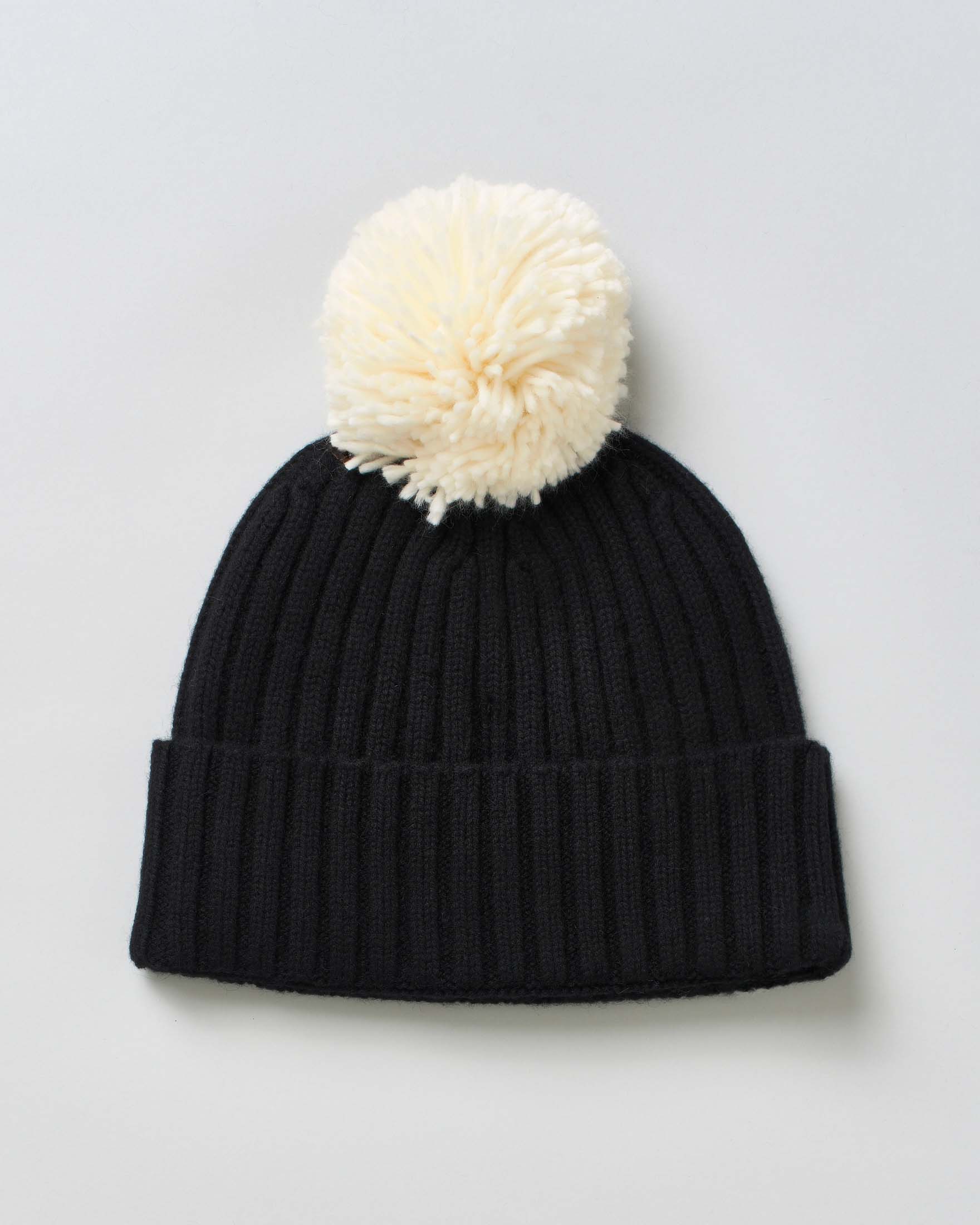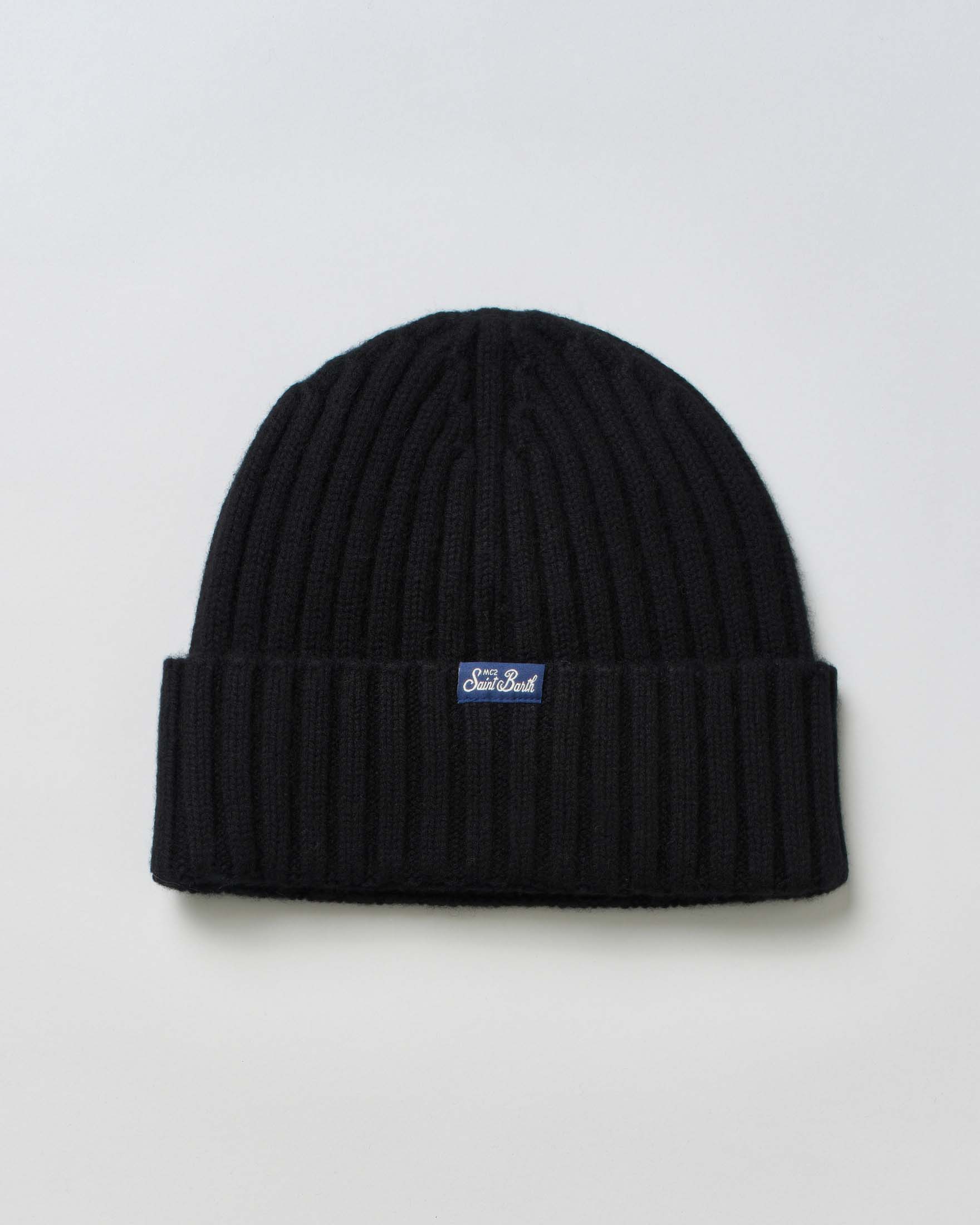 Berretto MC2 Saint Barth nero in maglia di lana e cachemire a coste inglesi con ricamo logo e pompon...