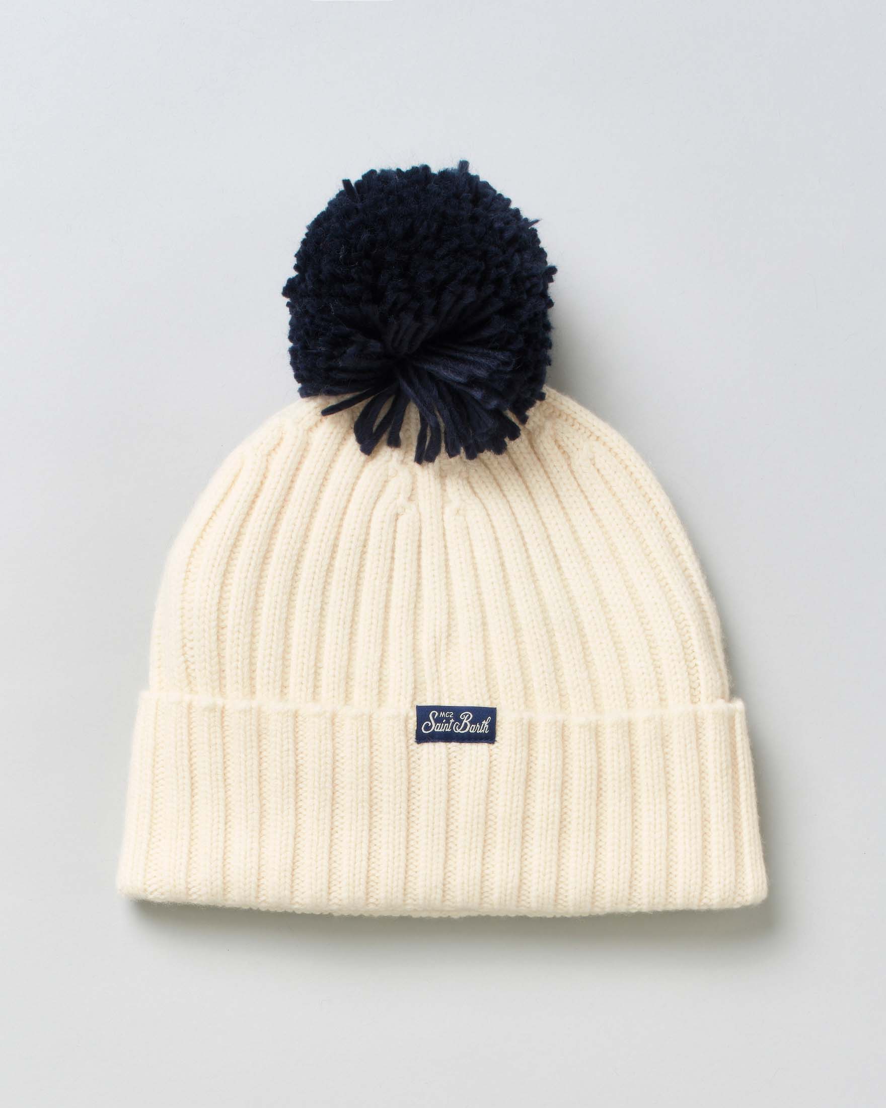 Berretto MC2 Saint Barth panna in maglia di lana e cachemire a coste inglesi con ricamo Après Ski e ...