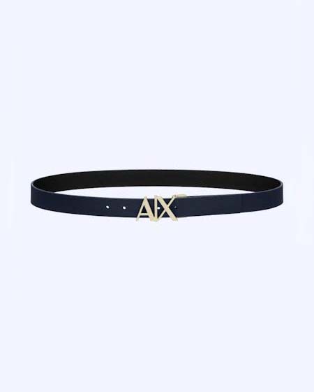 Cintura Armani Exchange nera in pelle reversibile in blu con fibbia AX in metallo dorato