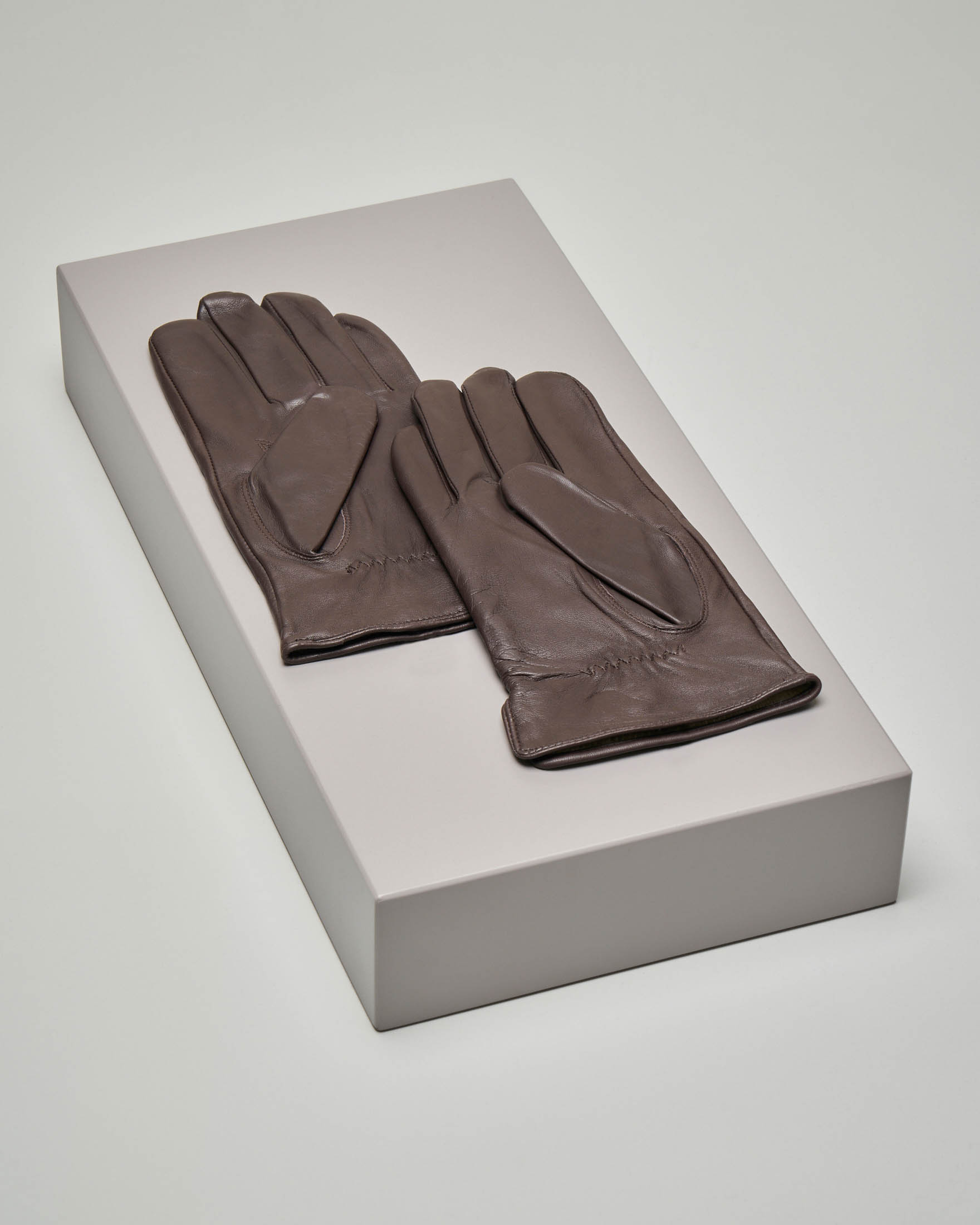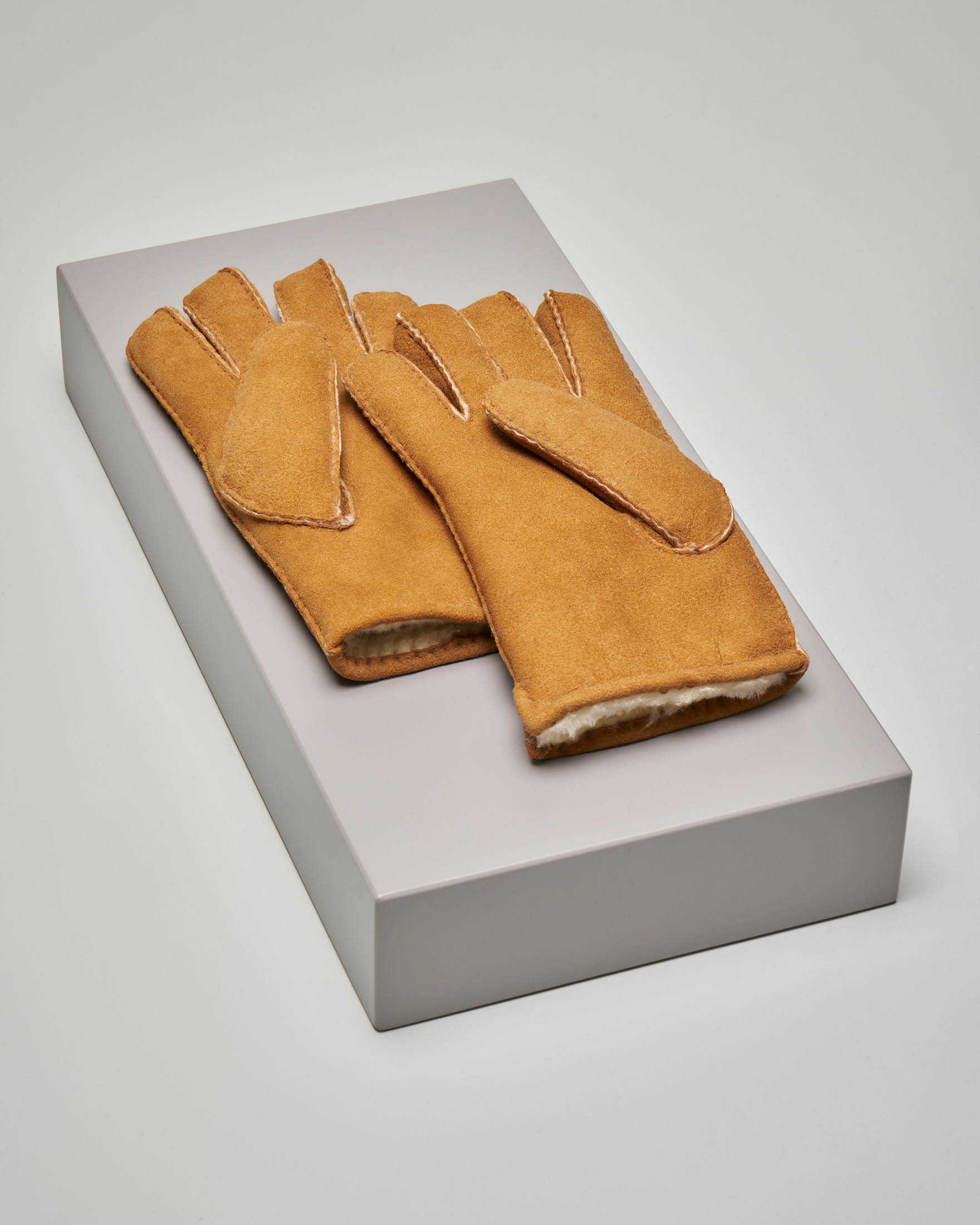 Guanti Pellizzari in pelle scamosciata color cammello con pelliccia bianca interna