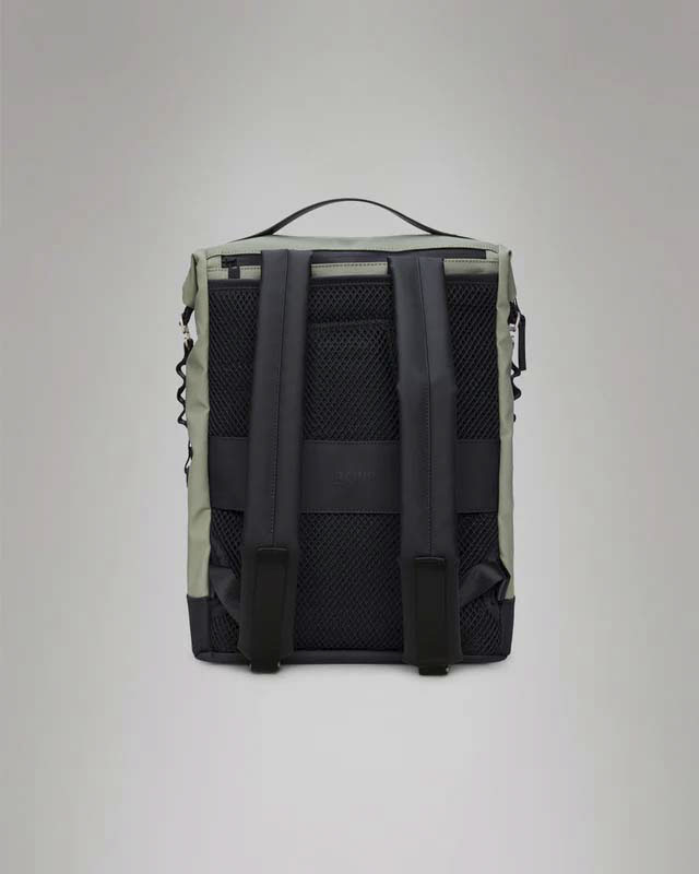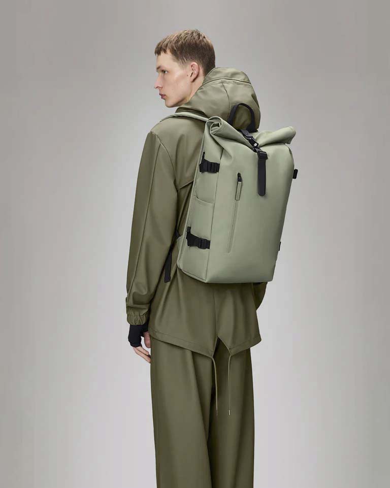 Zaino Rains Rolltop Rucksack Large verde salvia in tessuto tecnico impermeabile effetto gommato
