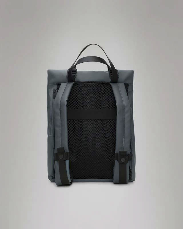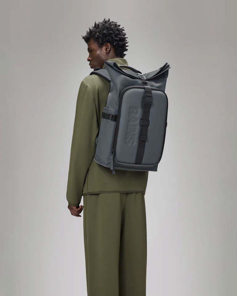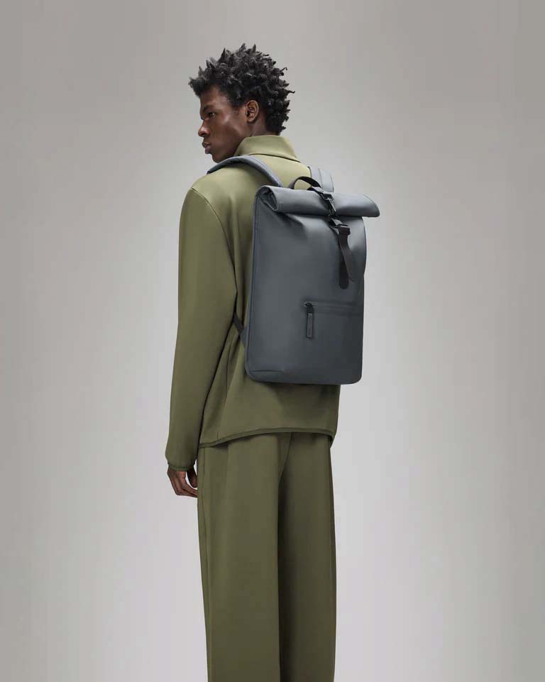 Zaino Rains Rolltop Rucksack ottanio in tessuto tecnico impermeabile effetto gommato