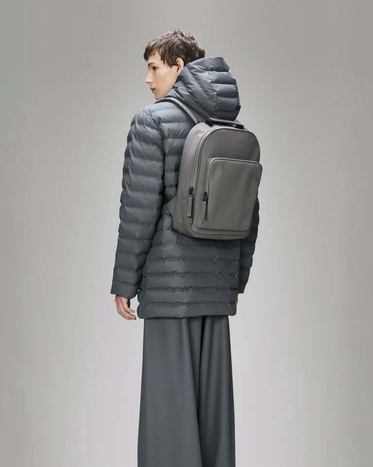 Zaino Rains Book Daypack grigio in tessuto tecnico impermeabile effetto gommato con tasca esterna